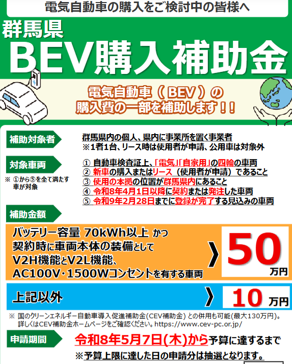 群馬県内の一部市町村は独自の補助金でEV普及を応援しています。