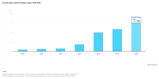 国際エネルギー機関の集計によると、2024年日本で新車販売された23輪車の7.2%が電動バイクでした。