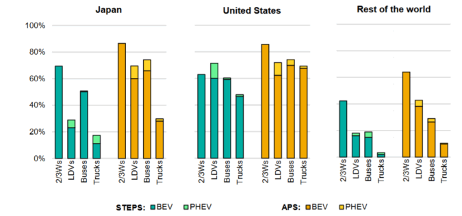 日本の四輪車(LDVs)のEVは緑と黄の差が大きく、政策を今後どれだけ強化する次第で、EVが2035年の日本で少数派か、多数派になるかが変わるということを意味しています。