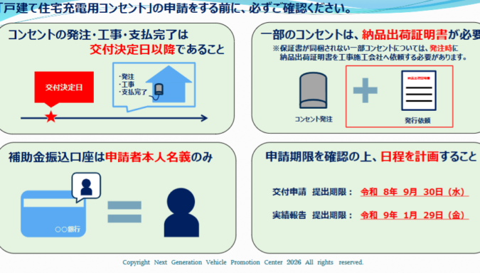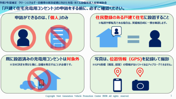 申請できるのは、補助対象として承認された新品の充電用コンセントを購入し、設置土地の使用権限を持つ個人です。